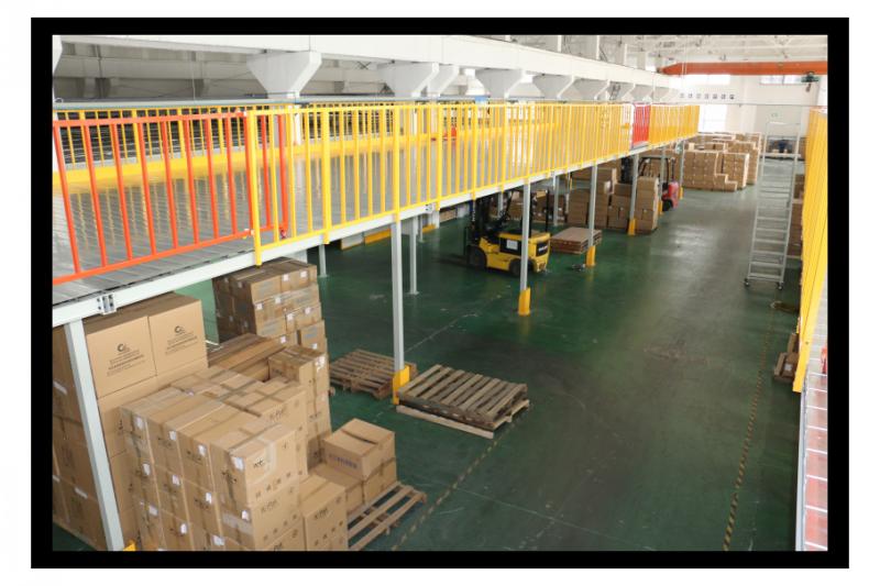 4、橫梁與立柱片掛接組裝成框架,最后鋪設(shè)鋼層板,至此一組完整的中型貨架成型。