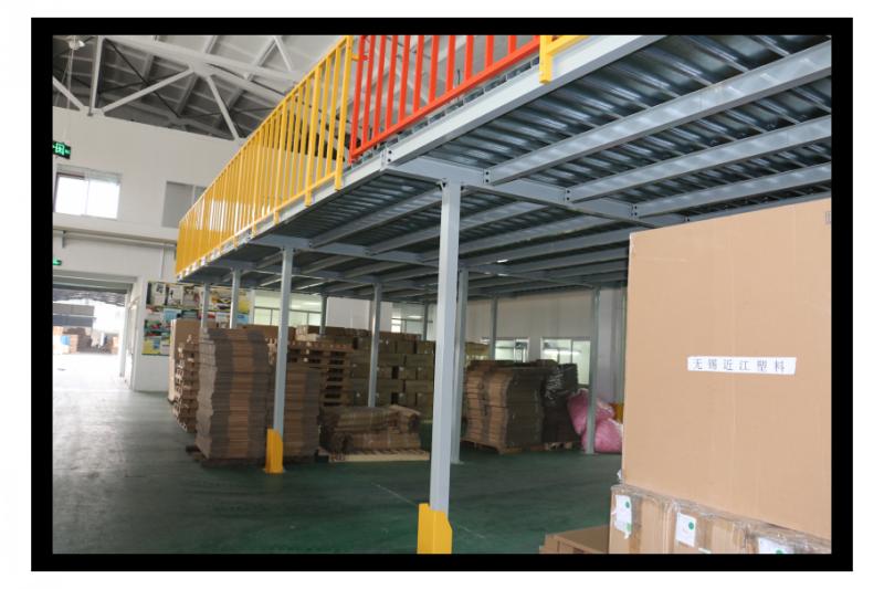 4、橫梁與立柱片掛接組裝成框架,最后鋪設(shè)鋼層板,至此一組完整的中型貨架成型。